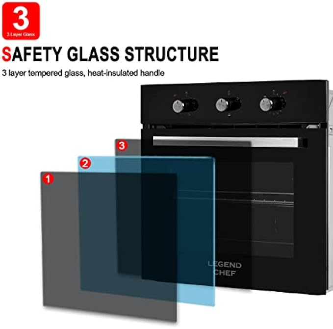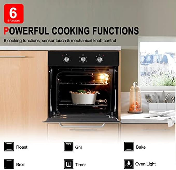 24'' Single Wall Oven, LEGEND CHEF LC-ES606MB 24 Inch Built-in Electric Ovens With 6 Cooking Functions, 2.3 Cu.Ft 2000W Electric Single Wall Oven, Mechanical Knobs Control in Black Glass