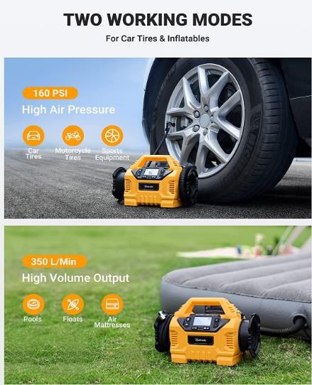 • Ultra-fast Inflation & 20 Mins Continuous Use: With dual metal motors and a metal cylinder, the car tire pump can continuously work for up to 20 minutes. Large-volume mode provides a maximum inflation rate of 350L/min, quickly inflating items. High-pressure mode pumps up to 160 PSI, inflating a flat tire from 0 PSI to 36 PSI in 5 minutes. Compatible with cars, bikes, sedans, and mid-sized SUVs. NOTE: This pump is incompatible with heavy-duty trucks.
