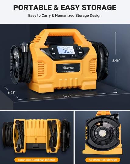 • Convenient Storage: The tire inflator has an integrated accessory storage compartment along with slots for storing the included hoses and caps on either side; the power cord can be stored within the unit’s base, making it easy to carry everything you need. This package includes: AstroAI air pump, AC/DC power cord, rechargeable battery pack and its charger, three nozzles, one needle valve adapter, three large-volume nozzles, one replacement fuse, and a user manual.