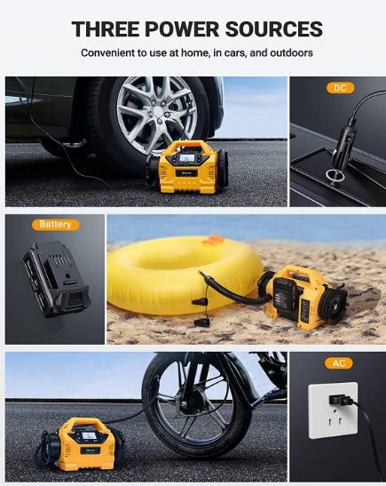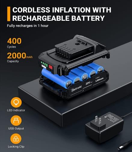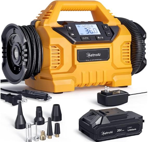 • Three Power Supplies: The AstroAI portable air compressor provides portable inflation anywhere with its 110V AC / 12V DC power inputs and a rechargeable battery. A rechargeable battery pack and its charger are included. The tire pump will automatically analyze and accept the power input from 12V cigarette lighters, 110V home outlets, or its rechargeable battery. Convenient for, home, travel, and outdoor use.