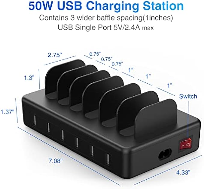 ?【6 IN 1 Charging Station】The Charging Station for Multiple Devices has 6 USB ports.You can charge 6 devices at the same time,our Phone Charging Station each USB Single Port output 5V/2.4A max. Charging up to 80% in just 35 minutes fastest, charge speed faster than other regular chargers of 2A or less.
