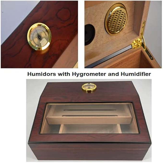 Cigar Humidors,Acanyewit Spanish Cedar Handmade Cigar Box with Thermometer Hygrometer, Handcrafted Desktop Cigar Humidor Box with Glass Top Display,Hold 25-50 Cigars