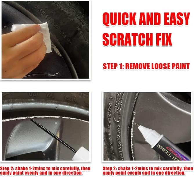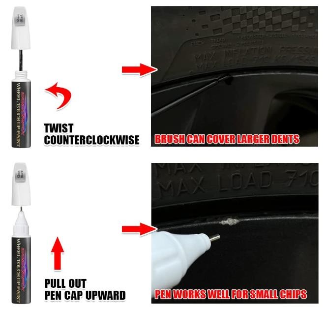 • Quick & Easy Scratch Fix - This Car Rim Paint Pen is Easy to Use. Just Clean the Surface, Shake for 1 Min and Paint. Apply Use Multiple Coats to "Build Up" Minor Scratches Depending on Depth of Damage. Dries in Just 10 Minutes. (The pen works well for small chips, the brush can cover larger dings.)