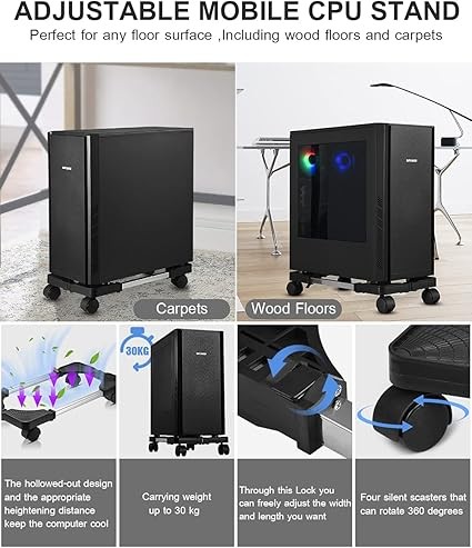 b.【PROTECTION STABLY】This is a great stand for your computer. you will like the open bottom as it provides plenty distance from the floor which is essential for cooling and minimizing dust intake. It is sturdy and the wheels allow you to move the computer easily for cleaning or attaching peripherals.desktop computer stand,pc holder,pc stand for carpet,pc holder under desk,computer tower stand floor,computer case stand