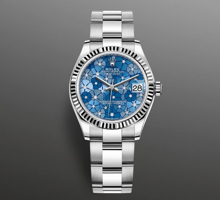 THIS OYSTER PERPETUAL DATEJUST 31 IN OYSTERSTEEL AND WHITE GOLD FEATURES AN AZZURRO-BLUE FLORAL-MOTIF, DIAMOND-SET DIAL AND AN OYSTER BRACELET.