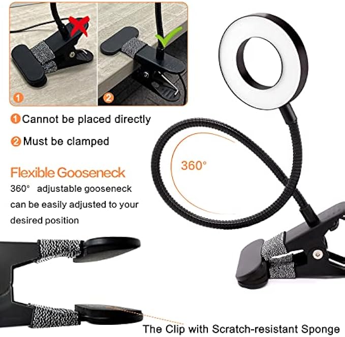• 【360°Flexible Gooseneck & Sturdy Clip】The 360°flexible gooseneck allows you to easily adjust and direct the light to where you want it. The sturdy metal clip opens to 2.36 inches and is also very portable for fixing on desk, table, dressing cupboard, headboard, computer, and other locations.The Ring design is great for better heat dissipation and enjoy a larger luminous area.