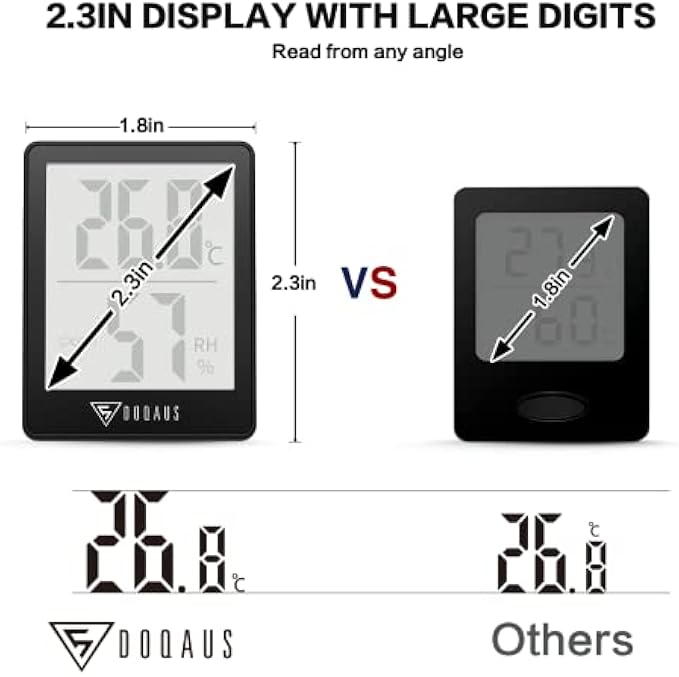 [2.3in Easy-to-Read LCD Display]: The thermometer hygrometer features a 2.3in clear LCD display with large bold numbers, allowing you to read the digital from any angle. The hygrometer digital is lightweight, compact, and easy to carry.