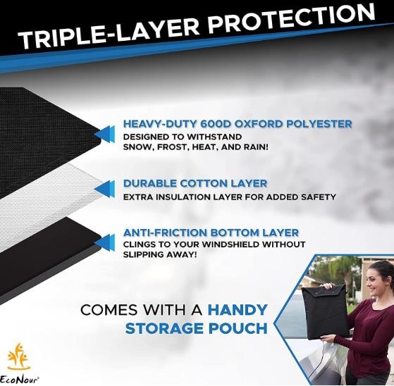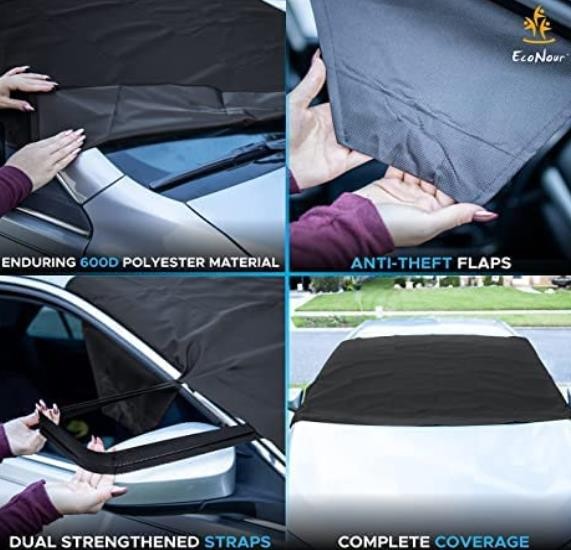 EcoNour Snow Protector Covers are made out of 600D waterproof oxford material with a soft inner material that prevents scratches on the mirrors and protects your wiper blades and can be folded, stored conveniently in the glove box. Easy to wipe clean and it is machine washable. The anti-theft design prevents the cover from being blown away by the wind.