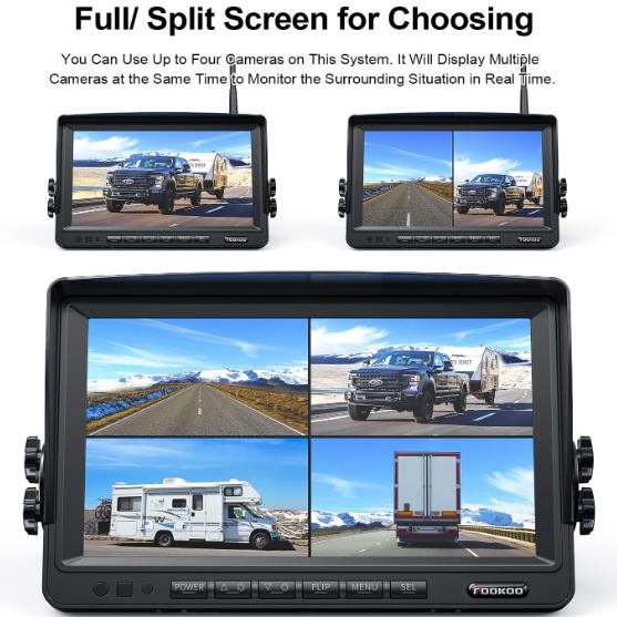 Fookoo 1080P 7" Wireless Backup Camera System, 7" HD Dual/Quad Split Monitor with Recording, IP69 Waterproof Rear View Front View Cameras with Parking Lines, Suits for RV/Truck/Trailer/Van/Bus(DW702)