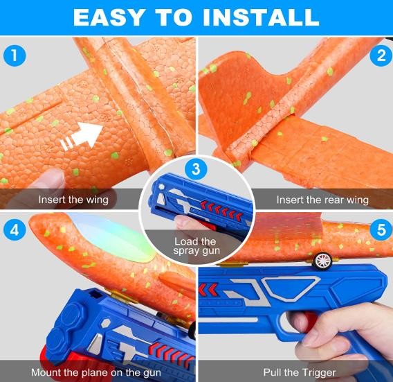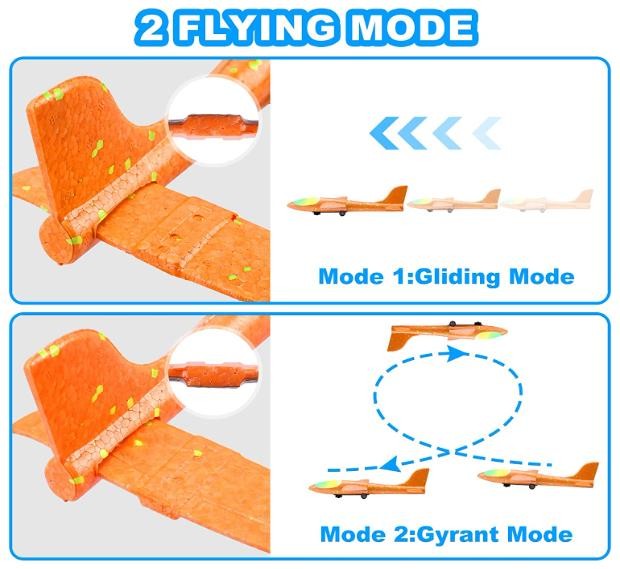 How to Use - 1. Insert the wing. 2. Choose the flight mode (Gyrant Mode & Gliding Mode) according to the position of the rear wing of the foam airplane, and insert the tail 3. Place these flying toys at the firing launcher position 4. Push and pull the load, pull the trigger, and the glider plane takes off.