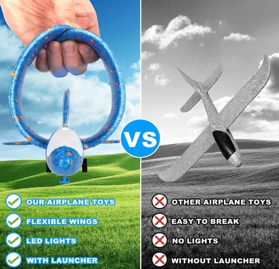 Safe & Fun for Play - Flying airplane is made of molded foam, safe, bendable, and will not harm kid's hands or feet, and comes with colorful LED lights, kids can enjoy the fun of flying toys even at night. Strong warranty, plz contact seller directly first for any problem you suffered, we will solve it perfectly for you.