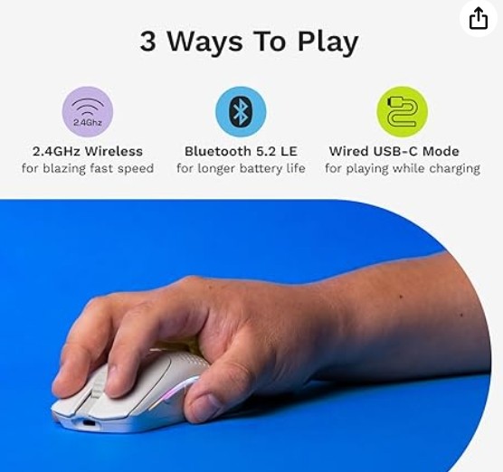 3 Ways to Play: Choose 2.4GHz wireless (110 hours of battery life), Bluetooth 5.2 LE (210 hours of battery life), or Wired Mode for uninterrupted gameplay while charging.