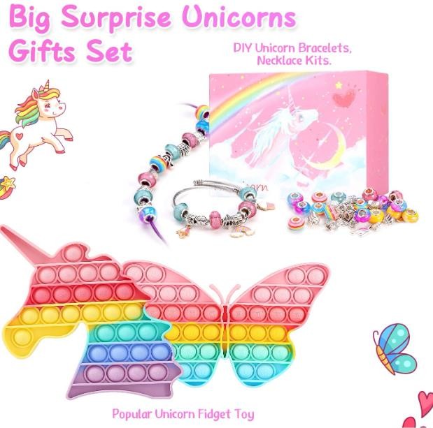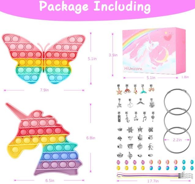 PACKAGE INLUDED: 1 Rainbow Unicorn Pop Toy, 1 Rainbow Butterfly Pop Toy, A set of 67pcs DIY Jewelry Kit with 3 adjustable bracelets, 3 leather necklaces (pink / yellow / purple), 20 colorful or rainbow beads, 16 silver-plated metal beads, 14 cute dangles, 8 small rubber band (Used on bracelets to prevent beads from falling out),1 DIY Instruction.1 pink unicorn gift box