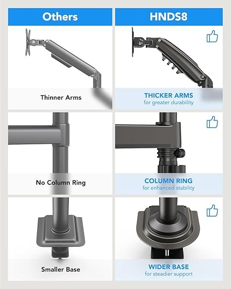 Additional Height Design - HUANUO dual monitor mount features an additional 17-inch column, which allows the maximum height to be raised up to 25.19" after lifting the monitor (VESA center to desktop). This extra design greatly benefits individuals who prefer a higher viewing angle or have a taller stature, providing them with more height adjustment options to alleviate discomfort during long hours of work.