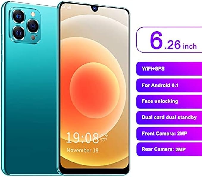 ip12 Pro MAX Unlocked Smartphone for Android 8.1, 6.26in 1+8GB HD Screen Cell Phone Dual Card Dual Standby Smart Phone,Face ID Recognition,2MP+2MP,128GB of Expandable Storage Mobile Phone(Green)
