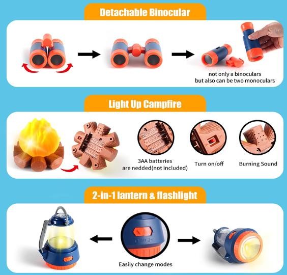• 【Multiple Scenes Camping Play Set Using】Camping set for kids allows kids to multiple roles-play. Kids could sit in the camping tent watch the toy campfire or sit near the grill so they can pretend to cook food. Or use the telescope for more adventure explore.