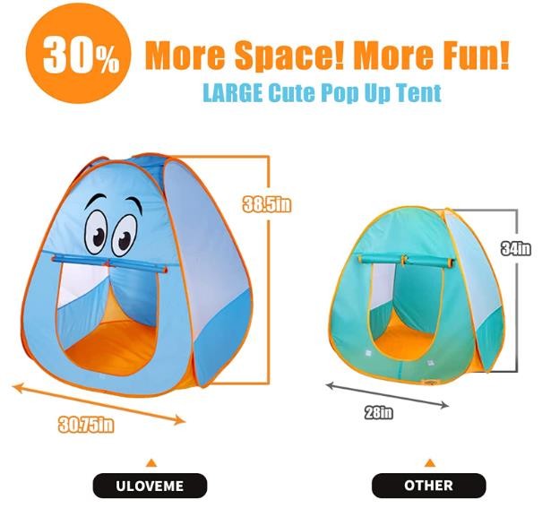 • 【Extra-Large CUTE Tent】Collapsible pop up children's' play tent, easy to set it up in seconds. Extra-Large design provide more space for children playing or reading together in it which comfortably fits 2-3 kids for indoor and outdoor activities. Cute eye-catching design make it unique.