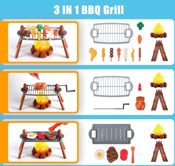 • 【Pretend Grill Anywhere】Simulate the barbecue activities, whatever indoors or outdoors little boys and girls can experience a funny barbecue, satisfying their desire to grill like parents. They also can feel the burning bonfire(need 3AA batteries, not including), listen the sounds like burning wood and pretend taste the delicious food.