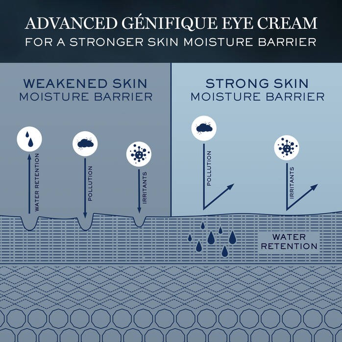 Protection: Formulated with Bifidus Prebiotic and Hyaluronic Acid, Advanced Génifique Eye Cream helps to accelerate skin’s moisture barrier recovery*. A strong skin barrier helps to lock in hydration and defend against external aggressors including pollution, cold and dry weather.  Advanced Génifique also helps improve the appearance of fine lines caused by dehydration or due to thinning skin, which can eventually deepen into wrinkles.