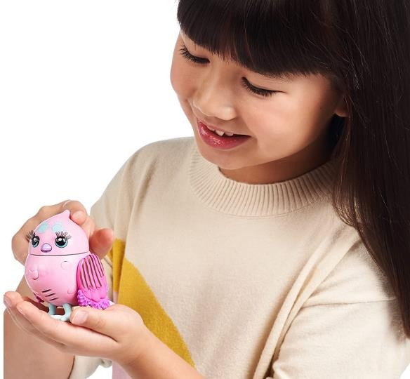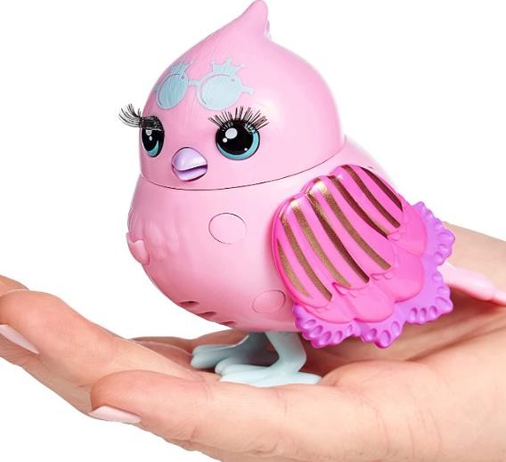 Little Live Pets - Lil' Birds are the sweetest birds you'll ever meet! These adorable little round birds with big beautiful eyes and long beautiful lashes, come to life in your hands as you pet and interact with them. Meet Princess Polly - With a majestic sweet voice, this pretty winged princess truly owns her throne! Gently stroke Princess Polly's back and she will tweet and turn her head for you! She really reacts to your touch! The more you pet, the happier your Lil' Bird will get! Princess Polly will chirp and tweet for longer and eventually whistle a tune for you! She loves to chat and repeat what you say! Press her talk button on her chest and say your message. Princess Polly will move her beak and turn her head while immediately repeating your message back to you! These colorful toy birds will brighten your day with over 20 bird sounds to sing! Princess Polly has very regal wings and looks so majestic with her crown glasses on her head! Collect the other Lil' Bird Pretty Posh and clip her Birdhouse to Princess Polly's house to create a beautiful hanging display! Each Lil' Bird has decorations and features on their wings and faces that relate to a certain theme. Get them all to form your own fabulous flock!