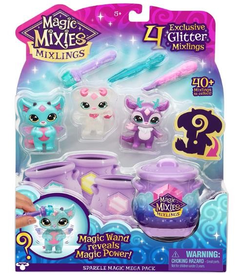 "Magicus Mixus!" Get ready to make real magic and discover the world of Magic Mixies Mixlings, a cute new breed of Magic Mixies for you to conjure up! The Sparkle Magic Mega Pack includes 4 Mixlings with an exclusive sparkly finish plus one mystery sparkly Mixling in the included Cauldron. Who will you find inside? Each Mixling in the Sparkle Magic Mega Pack has a different magical power that is revealed with the 3 included magic wands. Harlie is a Flier - tap his Gem with your Wand and he will reveal his beautiful wings. Gexi is a Spellster - use your wand to see her light up the night as she makes herself bright! And Mava is a Vanisher - this Mixling has a disappearing spell and can become invisible! Who else will you find inside the Cauldron and what magical team will they belong to? To find out, first, rub the Cauldon's gem to reveal if the Mixling inside is Common, Rare or Ultra-Rare! Then, say the magic words 'Magicus Mixus' and open the Cauldron to reveal your Mixling. Mischievous and magical, Mixlings are so much fun as you cast spells and unlock different ways to play. You can repeat the magic Cauldron Gem reveal again and again and at the end of the day you can use the Magic Cauldron to store your Mixling and other trinkets. With over 40 little magic toy Mixlings to create and collect throughout Series 1, there are so many magical moments to discover with Mixlings!
