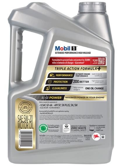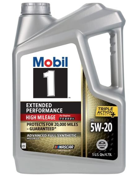 You trust your car to keep you going—even after 75,000 miles. Mobil 1 Extended Performance High Mileage full-synthetic motor oil 5W-20 gives engines with over 75,000 miles the extra care they need to go the distance. Formulated to help prevent leaks, it helps to protect critical engine parts for up to 20,000 miles between oil changes—guaranteed.* Mobil 1 Extended Performance utilizes Mobil 1’s Triple Action+ Formula to combine outstanding engine performance, protection, and cleanliness with the added benefit of maximized engine power. Specialty components in synthetic oil reduce friction, helping to prevent and remove sludge buildup in just one oil change. This technologically advanced formulation provides 20X better** internal engine heat protection than industry standards (up to 500 degrees Fahrenheit) as well as excellent low-temperature protection (to -40 degrees Fahrenheit)—bringing quick cold-weather starting and ultra-fast protection to your engine. Mobil 1 Extended Performance meets ILSAC GF-6 standards to help provide low-speed pre-ignition (LSPI) and timing chain wear protection while keeping your engine clean and helping to improve your fuel economy. Available in 1-qt. and 5-qt. bottles, Mobil 1 Extended Performance full-synthetic motor oil 5W-20 also helps control oxidation to prevent oil breakdown. This cutting-edge formula is recommended by ExxonMobil for all types of modern vehicles, including high-performance, turbo-charged, and supercharged gasoline and diesel multi-valve fuel-injected engines found in passenger cars, SUVs, light vans, and light trucks. Mobil 1 is America’s #1 synthetic motor oil brand at retail,*** trusted and recommended by car builders and experienced mechanics, and is the Official Motor Oil of NASCAR(R). (*Protects for up to 20,000 miles or 1 year, whichever comes first. To learn more about the Mobil 1 Limited Warranty, visit Mobil.US. **Based on Seq IIIH vs industry limits. ***Source: The NPD Group/ Retail Tracking Service/ Dollar Sales/ PCMO full-synthetic/ 52 weeks ending Aug 28, 2021)