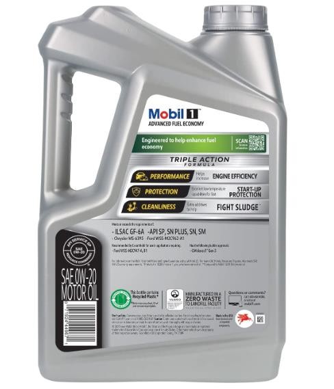 Keep Your Engine Running At Peak Efficiency While Improving Fuel Economy. . Engineered For Today’S Advanced And Hybrid Engines, Mobil 1 Advanced Fuel Economy Full-Synthetic Motor Oil 0W-20 Helps To Improve Fuel Economy* And Extend Engine Life For Vehicles Of All Ages. Mobil 1 Advanced Fuel Economy Utilizes Mobil 1’S Signature Triple Action Formula To Deliver Outstanding Engine Performance, Protection, And Cleanliness To Your Vehicle. Specialty Components In Synthetic Oil Reduce Friction, Helping To Prevent Deposits And Sludge Buildup To Keep Critical Engine Parts Clean And Protected For Up To 10,000 Miles Between Oil Changes. This Technologically Advanced Formulation Offers Outstanding Engine Efficiency, Wear Protection, Internal Engine Heat Protection (Up To 500 Degrees Fahrenheit), And Low-Temperature Protection (To -40 Degrees Fahrenheit)—Bringing Quick Cold-Weather Starting And Ultra-Fast Protection To Your Engine. Mobil 1 Advanced Fuel Economy Meets Ilsac Gf-6 Standards To Help Provide Low-Speed Pre-Ignition (Lspi) And Timing Chain Wear Protection While Keeping Your Engine Clean And Helping To Improve Your Fuel Economy. Available In 1-Qt. And 5-Qt. Bottles, Mobil 1 Advanced Fuel Economy Full-Synthetic Motor Oil 0W-20 Also Helps Control Oxidation To Prevent Oil Breakdown And Is Recommended By Exxonmobil For All Types Of Modern Vehicles, Including High-Performance, Turbo-Charged, And Supercharged Gasoline And Diesel Multi-Valve Fuel-Injected Engines Found In Passenger Cars, Suvs, Light Vans, And Light Trucks. Mobil 1 Is America’S #1 Selling Synthetic Motor Oil Brand At Retail, Trusted And Recommended By Car Builders And Experienced Mechanics, And Is The Official Motor Oil Of Nascar(R). (Potential Fuel Economy Improvement Obtained By Switching From Higher-Viscosity Oils To A Lower-Viscosity Grade. Actual Savings Are Dependent Upon Vehicle/Engine Type, Outside Temperature, Driving Conditions, And Your Current Engine Oil Viscosity. Protects For Up To 10,000 Miles Or 1 Year, Whichever Comes First.
