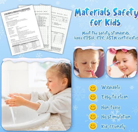 【Durable & Material Safety Makeup Set】: Girls can have their own makeup toys kit! Our kids make up toys kit is made of mild ingredients to protect the girls' delicate skin. Meet the international safety standards for children's toys, with 3 certificates of CPC, CPSIA, ASTM to ensure the safety of use. Easy to remove. You only need to use soap and water without a professional makeup remover. The ideal choice for kids to play makeup, give them peace of mind.