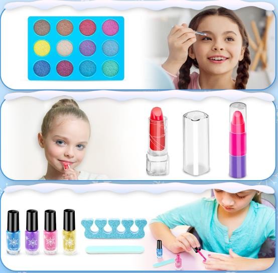 【Frozen Theme Kids Makeup Kit for Girls】: More color matching, more nail painting tools, 45 Pcs multi-functional makeup toys including Eye Shadow Color x 8, Gloss Eye Shadow Color x 6, Eyebrow x 2, Blush Color x 2, Trio Blush x 1, Lip Gloss Color x 6, Lipstick x 2(Includes 3 Colors), Makeup Brush x 10, Powder Puff x 1, Nail Polish x 4, Nail File x 1, Toe Separator x 1, Makeup Box with Mirror x 1. Girls with makeup will be more beautiful and more confident.