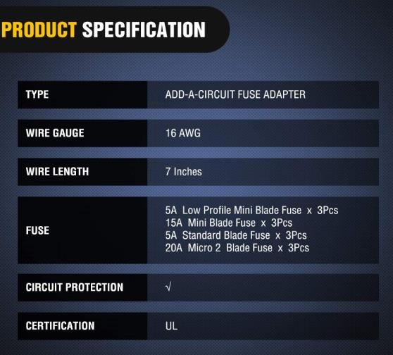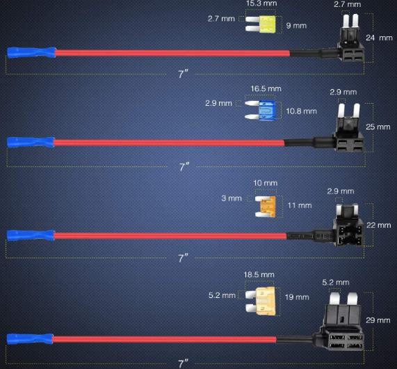 Product details: Nilight 12 Pack 4 Types Car Add-A-Circuit Fuse Tap Type: 1.Standard add-a-circuit fuse tap 2.Mini add-a-circuit fuse tap 3.Micro2 fuse tap 4.Low Profile Mini fuse tap Cable Type: Heavy duty 16 gauge wire Support Fuse Type: Blade fuse(rating 1Amp-30Amp) Compatible with 12/24VDC electrical systems Fits for Most Vehicles (such as cars, trucks, SUVs, 4X4, boats and RVs), Car Electronic Device (eg: Dashboard camera, radar detector, GPS, car recorder, car alarm, radio, DVD player and other electronic devices.),Boat (for adding LED strip, DVD player, GPS, radio and other electronic), GPS and Circuit Diagram, etc How to Use: 1.Crimp the fuse tap on the end of wire 2. Plug and play at the fuse box