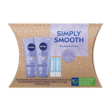 NIVEA Simply Smooth Gift Box is a great gift for everyone on your list! As the world's #1 skin care brand, NIVEA understands skin like no one else. That's why we create products that cleanse, nourish and protect your skin, while giving it exactly what it needs - gentle yet effective care that keeps your skin smooth, supple and radiantly beautiful. This gift set includes two (2) 2.6 ounce tubes of NIVEA Skin and Cuticle Care Hand Cream and two (2) .17 oz tubes of NIVEA Smoothness Lip Balm. Both items are the perfect travel size and convenient for anyone who is on the go. NIVEA Skin and Cuticle Care softener delivers long-lasting softness and smoothness for your skin while offering long-lasting moisture. Enriched with Shea Butter, Macadamia Oil and Lotus Flower, and this formula strengthens the skin's protective moisture barrier to help keep your hands and cuticles smooth and soft. While NIVEA Smoothness Lip Care helps lips feel instantly hydrated and protected from dryness.