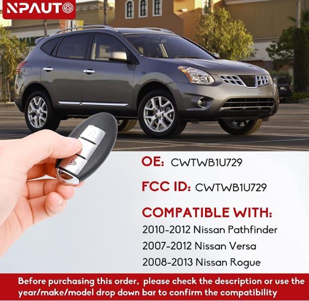 • ?【Fit for Vehicles】:This key fob transmitter replacement for Nissan Rogue 2008 2009 2010 2011 2012 2013 / Pathfinder 2010-2012 / Versa 2007-2012【NOTE】Before purchasing this order, please check the description or use the year/make/model drop down bar to confirm the compatibility