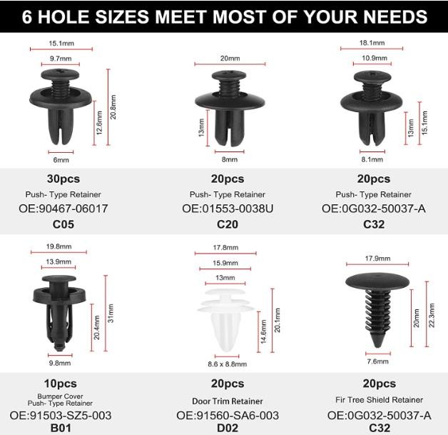 6 popular sizes car clips, applicable to side skirts, bumpers, car fenders, door trim panels, interior trim panels and various trim panels of various models