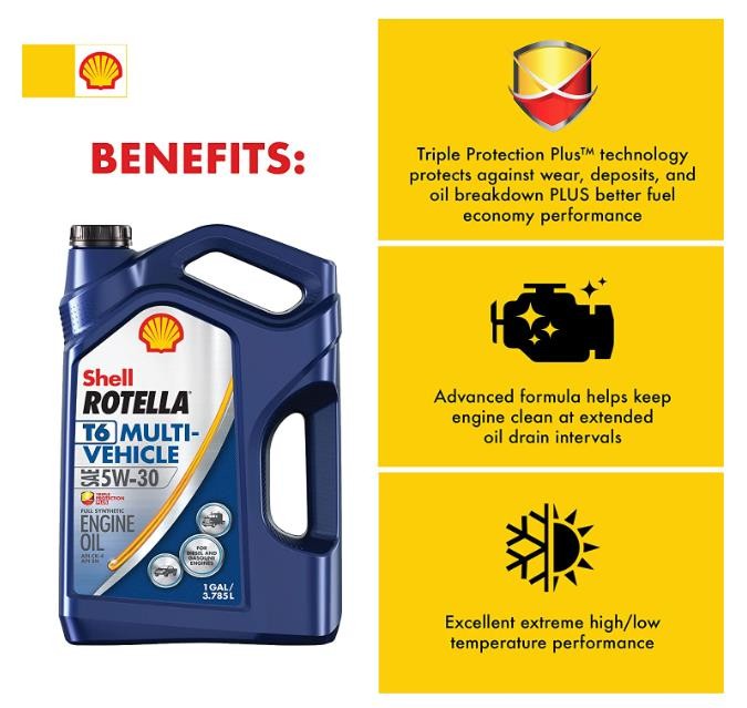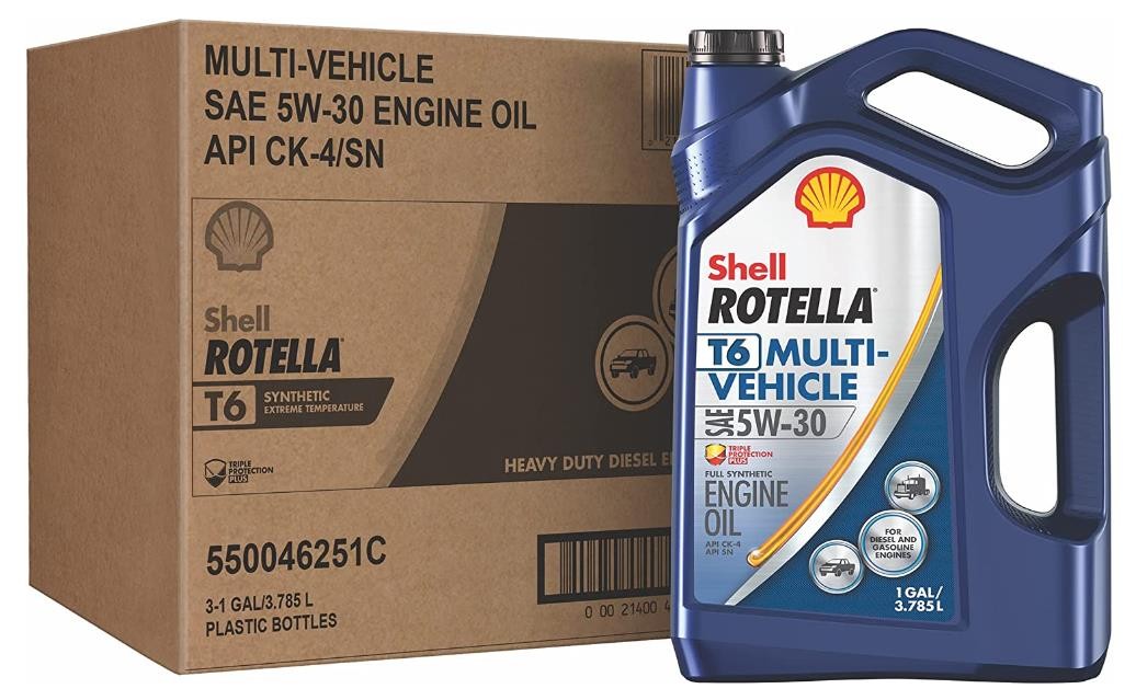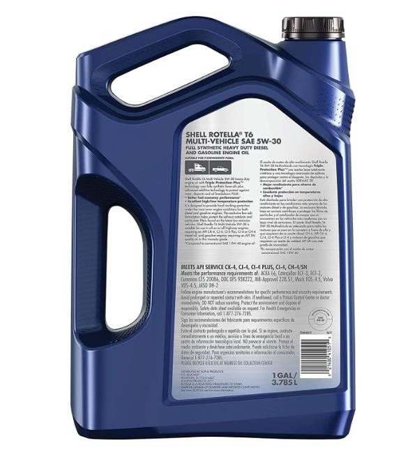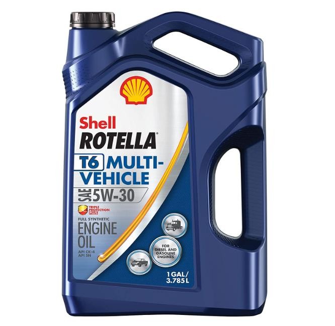 Shell Rotella T6 Multi-Vehicle 5W-30 heavy duty engine oil is a full synthetic motor oil that features exclusive Triple Protection Plus technology, formulated with fully synthetic base oils plus advanced additives to protect against wear, deposits, and oil breakdown. Performing extremely well in both diesel and gasoline engines, Shell Rotella T6 Multi-Vehicle allows mixed fleet customers to consolidate lubricants. Blended with lower levels of phosphorous compared to most diesel engine oils, Shell Rotella T6 Multi-Vehicle 5W-30 is able to meet both API CK-4 and SN performance standards. With its wide range of specifications and approvals from many of the world's leading engine makers, it is ideal for on- or off-road applications. The advanced technology in Shell Rotella T6 Multi-Vehicle 5W-30 helps to deliver excellent equipment protection, long engine life, and provides excellent high and low temperature protection. Exceeds the requirements of the following industry specifications: API CK-4; API SN; ACEA E6. Meets or exceeds the following OEM requirements: Caterpillar ECF-2/ECF-3; Cummins CES 20086,81; DDC DFS 93K222, 93K218; JASO DH-2; MACK EOS-4.5, EO-O Premium Plus; MB - Approval 228.51; Volvo VDS-4.5, VDS-4. For technical questions, contact the Shell Technical Help Desk.