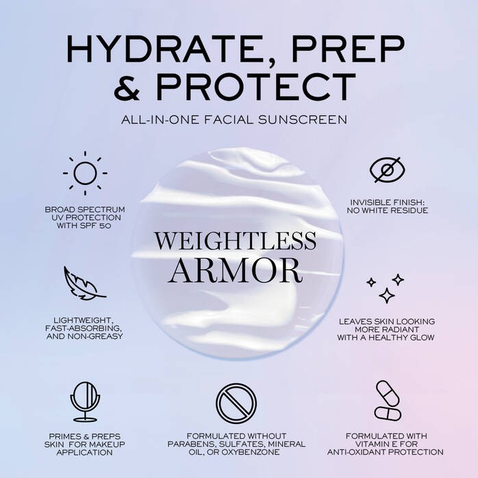 Your skin’s weightless armor to provide invisible sun protection. A three-in-one primer, moisturizer, and SPF 50.