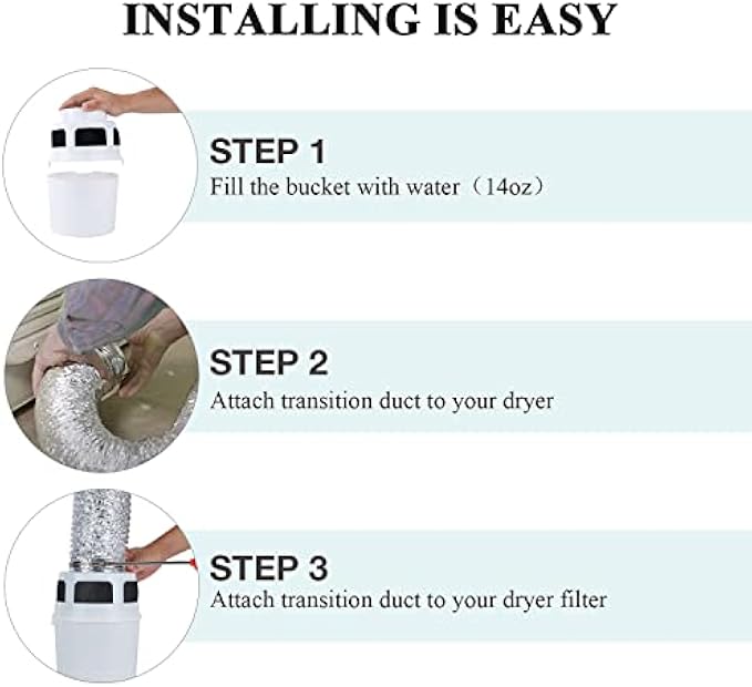 Quick and easy to install, please note that when you snap the hose to the filter bucket and the dryer it may be a little laborious, this design makes the connection more stronger