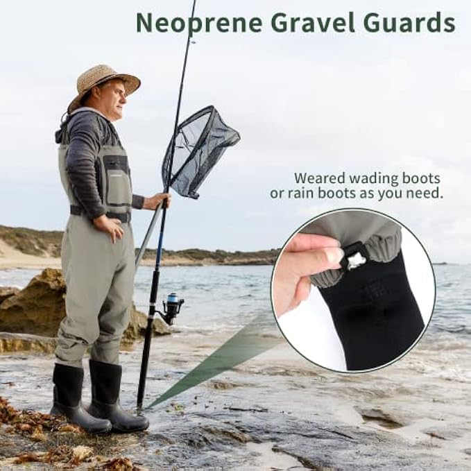 • [Attached Gravel Guards Protection] 3-ply abrasion resistant stocking foot in durable neoprene gravel guards provides warmth, protection and comfort for your feet. Stretch fabric design of stocking makes it a universal fit for different size of foot and avoid inappropriateness due to different foot size under the same size of waders.