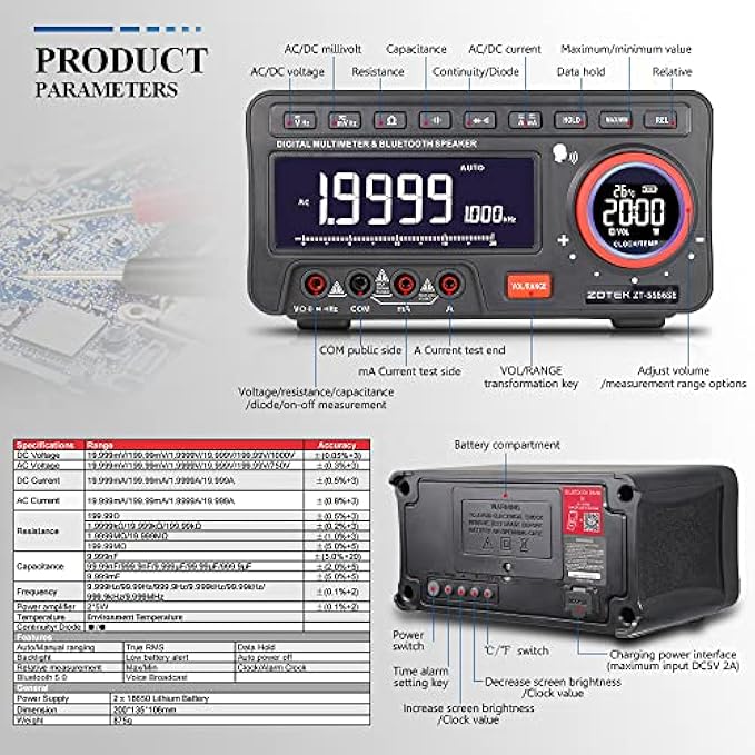 [Unique Design] Full-button function selection key, with e-Bull APP, Bluetooth audio, voice broadcast, LCD backlight display, adjustable backlight, with ambient temperature, temperature, and Fahrenheit conversion, with clock, alarm clock, suitable for For home, laboratory, electronics, auto repair, factory .and electronics hobbyist.